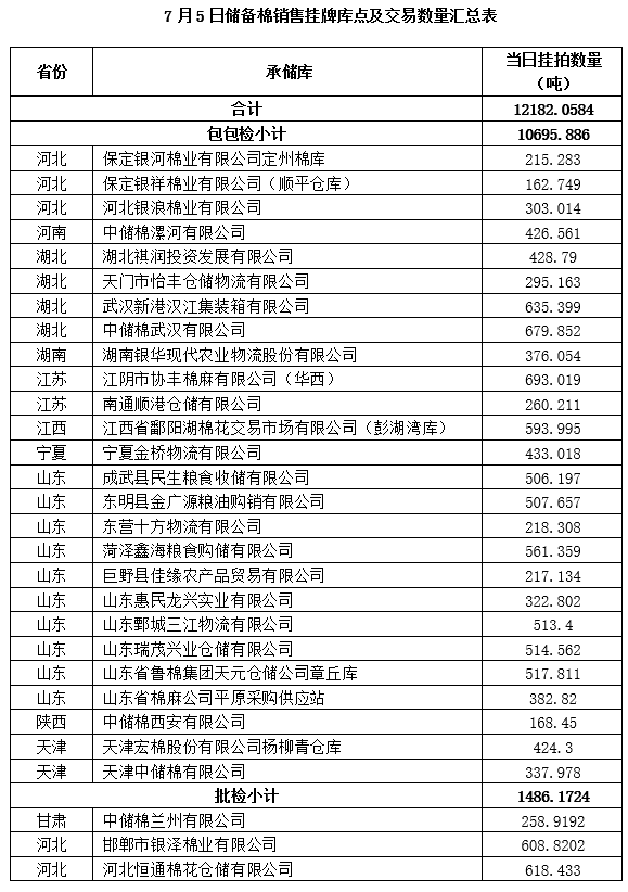 中國儲備棉管理有限公司定于7月5日上市銷售儲備棉重量12182.0584噸,共69捆。