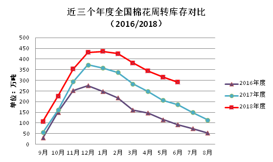6月紡織市場消費低迷,產(chǎn)品出貨不暢,紡企仍以去庫為主。月底G20峰會上,中美首腦會晤對推進中美貿易關系發(fā)揮積極作用。之后紡企適當補庫,棉花價格小幅反彈。本月儲備棉成交量、新疆運輸量雙雙下降。商業(yè)庫存雖有所下降,但降幅再次收窄。據(jù)中國棉花協(xié)會棉花物流分會對全國18個省市的164家棉花交割和監(jiān)管倉庫調查數(shù)據(jù)顯示:6月底全國棉花周轉庫存總量約291.74萬噸,較上月減少24.04萬噸,環(huán)比降幅收窄4.33萬噸;同比仍高105.64萬噸。