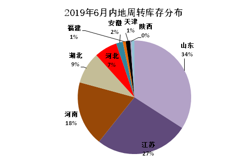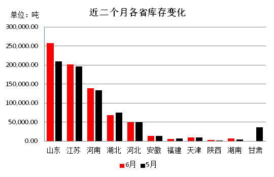 從各省庫存分布情況看:山東省庫存量居首位,為25.75萬噸,江蘇省次之20.13萬噸,河南省居第三位13.97萬噸,湖北省6.83萬噸,河北省4.93萬噸,安徽省1.43萬噸,其他省在萬噸以下。