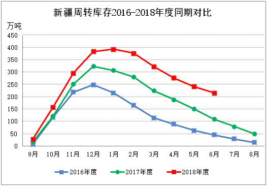 截至6月底新疆區(qū)內43家倉庫商品棉周轉庫存216.2萬噸,環(huán)比減少25.88萬噸,同比增加106.3萬噸。