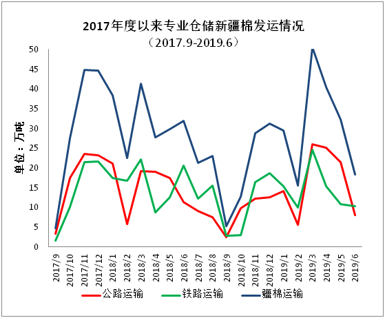 2018年9月-2019年6月出疆棉公路與鐵路共發(fā)運264.19萬噸,同比減少49.10萬噸,降幅15.67%。