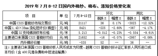 本周,國(guó)內(nèi)外棉價(jià)紛紛下跌;國(guó)內(nèi)棉紗價(jià)格先漲后跌,外紗價(jià)格弱穩(wěn)為主;滌綸短纖價(jià)格繼續(xù)回落。