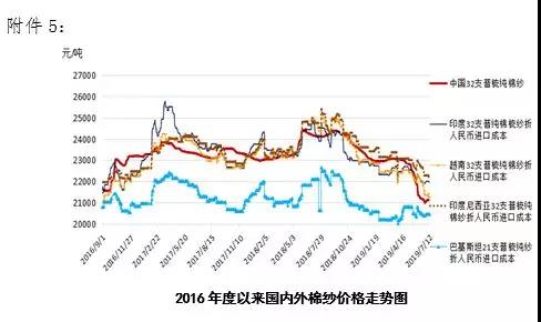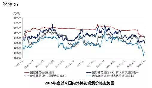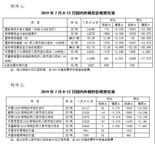 本周,受美國(guó)得州降雨和美國(guó)農(nóng)業(yè)部下調(diào)全球棉花消費(fèi)量影響,國(guó)際棉價(jià)承壓下跌。2019年7月8-12日,紐約棉花期貨主力合約結(jié)算價(jià)63.7美分/磅,較上周下跌3.29美分/磅,跌幅4.9%,代表進(jìn)口棉中國(guó)主港到岸均價(jià)的國(guó)際棉花指數(shù)(M)76.39美分/磅,較上周下跌1.65美分/磅,跌幅2.11%,折人民幣進(jìn)口成本13174元/噸,較上周下降276元/噸,跌幅2.05%;內(nèi)外棉價(jià)差1022元/噸,較上周擴(kuò)大200元/噸。(詳見(jiàn)附件1)