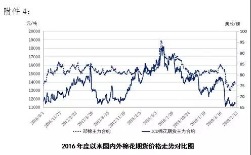 國(guó)際棉花市場(chǎng)延續(xù)謹(jǐn)慎態(tài)度。美國(guó)6月PPI同比上漲1.7%,為自2017年1月以來(lái)最小漲幅,美國(guó)PPI漲幅收窄意味著工業(yè)水平不佳,需求前景轉(zhuǎn)淡,疊加近期德意志銀行危機(jī)等金融市場(chǎng)脆弱表現(xiàn),市場(chǎng)將更為謹(jǐn)慎。國(guó)際棉花市場(chǎng)方面,近期得州降雨利于美棉生長(zhǎng),截至7月7日,美國(guó)新棉生長(zhǎng)狀況達(dá)到良好以上的為54%,較去年同期增加13個(gè)百分點(diǎn);印度季風(fēng)雨雨量今年首次高于長(zhǎng)期均值,截至7月10日的一周,印度降雨量比近50年同期均值高28%,抵消了6月份降雨缺乏對(duì)棉花播種的影響。USDA7月供需預(yù)測(cè)報(bào)告調(diào)增2019/20年度全球棉花產(chǎn)量10.2萬(wàn)噸至2738.7萬(wàn)噸,調(diào)減消費(fèi)量21.8萬(wàn)噸至2705.6萬(wàn)噸,全球產(chǎn)大于需由上月的1.1萬(wàn)噸擴(kuò)大至33.1萬(wàn)噸。皮棉現(xiàn)貨市場(chǎng)成交清淡,上周美棉出口凈簽約量較前周減少62%至1.21萬(wàn)噸,中國(guó)繼續(xù)毀約;印度棉價(jià)強(qiáng)力下降,市場(chǎng)詢(xún)價(jià)和成交緩慢;巴西棉上市量增加,實(shí)際成交量有限。國(guó)際棉紗詢(xún)價(jià)出貨延續(xù)低迷,巴基斯坦新增稅收后,巴紗銷(xiāo)售緩慢,下游布和服裝廠需求依然疲弱。在國(guó)際貿(mào)易形勢(shì)緊張和金融市場(chǎng)波動(dòng)背景下,預(yù)計(jì)短期內(nèi)國(guó)際棉花市場(chǎng)仍以謹(jǐn)慎為主,后續(xù)需持續(xù)關(guān)注印度季風(fēng)雨和美國(guó)棉區(qū)等天氣狀況。