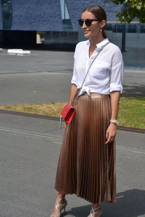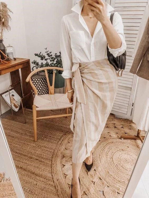 亞麻白襯衫+長度微過膝的迷笛裙