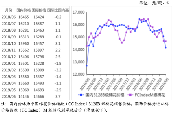 (一)國內(nèi)棉花現(xiàn)貨價(jià)格大幅下跌。6月上中旬,中美經(jīng)貿(mào)摩擦無緩解跡象,市場擔(dān)憂情緒加劇,下游紗線需求乏力,加工企業(yè)采購積極性不高,國內(nèi)棉花價(jià)格明顯下行。6月,國內(nèi)3128B級棉花月均價(jià)每噸14146元,環(huán)比跌6.1%,同比跌14.1%。鄭棉期貨主力合約(CF909)月結(jié)算價(jià)每噸13765元,環(huán)比漲1.9%,同比跌17.8%。