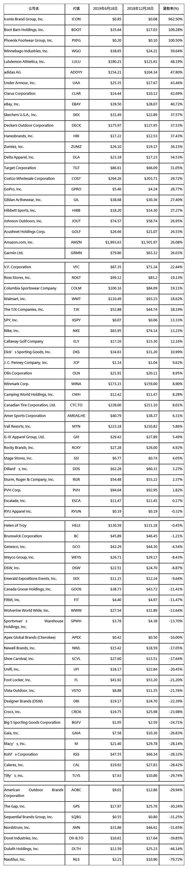Lululemon于2019年6月公布第1季集團盈利再次超越美國華爾街目標,展現(xiàn)14.4%成長,該公司股價除在2018年上漲54.7%外,在2019年上半年也超前48.2%。UnderArmour的品牌業(yè)務(wù)表現(xiàn)持穩(wěn),2018年回復22.5%后,在2019年上半年上漲43.5%。由于擔心成長放緩,adidas在2018年僅上漲6%,2019年上半年股價翻轉(zhuǎn)上漲47.8%。ClarustCorp.上漲42.7%,DeckersBrands上漲37.5%,其他行業(yè)股票在2018年都呈上漲趨勢。