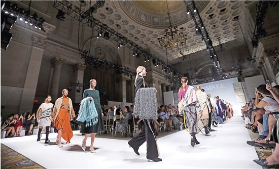 7月17日,在美國(guó)紐約,模特展示用康賽妮紗線制作的成衣。當(dāng)天,中國(guó)高端羊絨紗線品牌康賽妮在紐約舉行“時(shí)間織旅”時(shí)裝秀,展出88套采用康賽妮紗線制作的成衣作品。