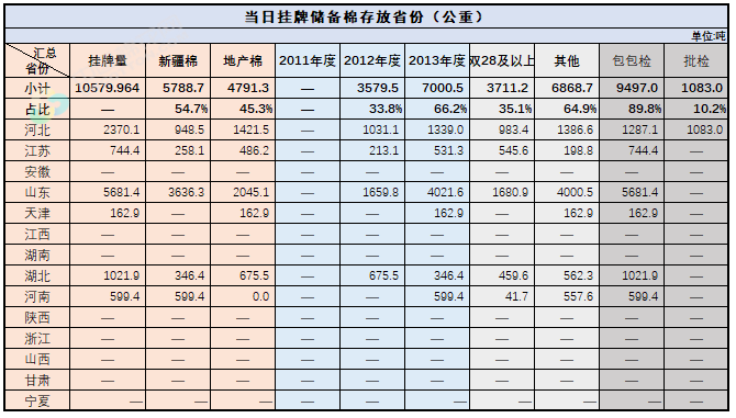 2.當日輪出上市儲備棉中有部分為分批抽樣公檢。抽樣比率及抽樣方法按照棉花國家標準規(guī)定,品質(zhì)指標包括顏色級、軋工質(zhì)量、長度、馬克隆值、斷裂比強度、長度整齊度指標;重量采用原入庫公檢結(jié)果,不再重新檢驗。