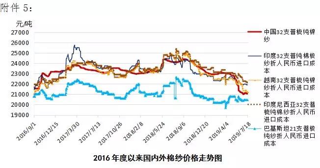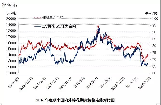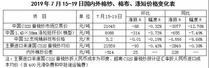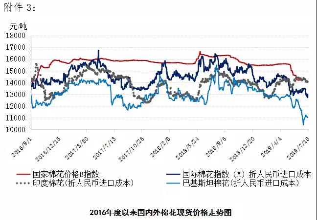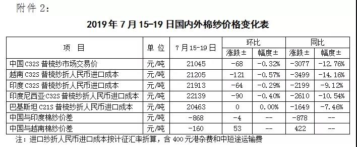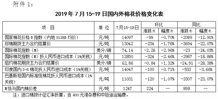 本周,美國新棉長勢良好,美棉現(xiàn)貨出口銷售持續(xù)低迷,國際棉價繼續(xù)下挫。2019年7月15-19日,紐約棉花期貨主力合約結(jié)算價62.86美分/磅,較上周下跌0.84美分/磅,跌幅1.32%,代表進口棉中國主港到岸均價的國際棉花指數(shù)(M)為71.14美分/磅,較上周下跌2.26美分/磅,跌幅2.11%,折人民幣進口成本12850元/噸,較上周下降324元/噸,跌幅2.46%;內(nèi)外棉價差1259元/噸,較上周擴大236元/噸。(詳見附件1)
