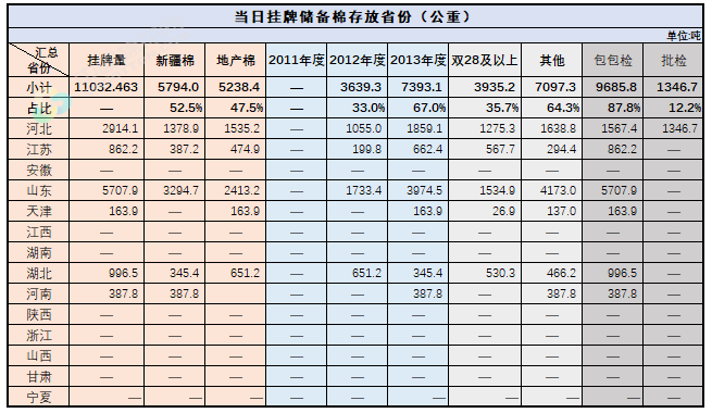 2.當(dāng)日輪出上市儲(chǔ)備棉中有部分為分批抽樣公檢。抽樣比率及抽樣方法按照棉花國(guó)家標(biāo)準(zhǔn)規(guī)定,品質(zhì)指標(biāo)包括顏色級(jí)、軋工質(zhì)量、長(zhǎng)度、馬克隆值、斷裂比強(qiáng)度、長(zhǎng)度整齊度指標(biāo);重量采用原入庫(kù)公檢結(jié)果,不再重新檢驗(yàn)。