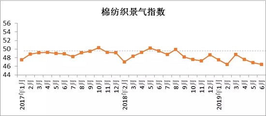 2019年6月中國(guó)棉紡織景氣指數(shù)46.43,與5月相比下降0.39。6月初,市場(chǎng)行情延續(xù)低迷,原料、產(chǎn)品價(jià)格繼續(xù)走低,紡企庫(kù)存持續(xù)增加,儲(chǔ)備棉成交量大幅下降,與5月成交率高企形成鮮明對(duì)比。6月18日,中美雙方元首互通電話,確定G20峰會(huì)會(huì)晤并就中美貿(mào)易問(wèn)題進(jìn)行溝通,市場(chǎng)迅速作出反應(yīng),原料價(jià)格有所回升,下游陸續(xù)啟動(dòng)秋季訂單,但由于前期庫(kù)存積累,紗布價(jià)格依然難有起色。7月初,在中美貿(mào)易重啟談判的利好消息下,下游得到短暫回暖,但由于7月本就是傳統(tǒng)紡織淡季,加上中美貿(mào)易形勢(shì)仍然存在較大不確定性,因此,市場(chǎng)觀望情緒依然濃郁。預(yù)計(jì)7月中國(guó)棉紡織景氣指數(shù)保持平穩(wěn)或略有下降。