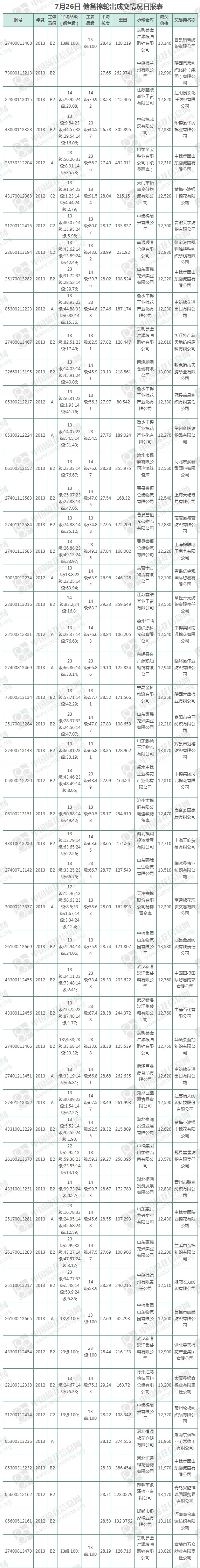 7月26日儲備棉輪出銷售資源10178.1362噸,實際成交10042.5402噸,成交率98.67%,成交均價12697元/噸,較25日上漲125元/噸;折3128價格13828元/噸,較25日上漲85元/噸。