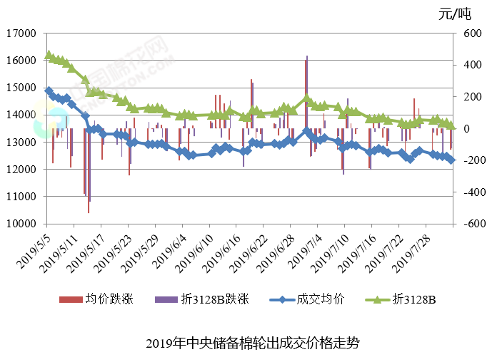 上周(2019年7月29日-8月2日)是2019年中央儲備棉輪出第十三周,中國儲備棉管理有限公司掛牌銷售儲備棉5.35萬噸,其中新疆棉2.42萬噸,地產(chǎn)棉2.93萬噸。