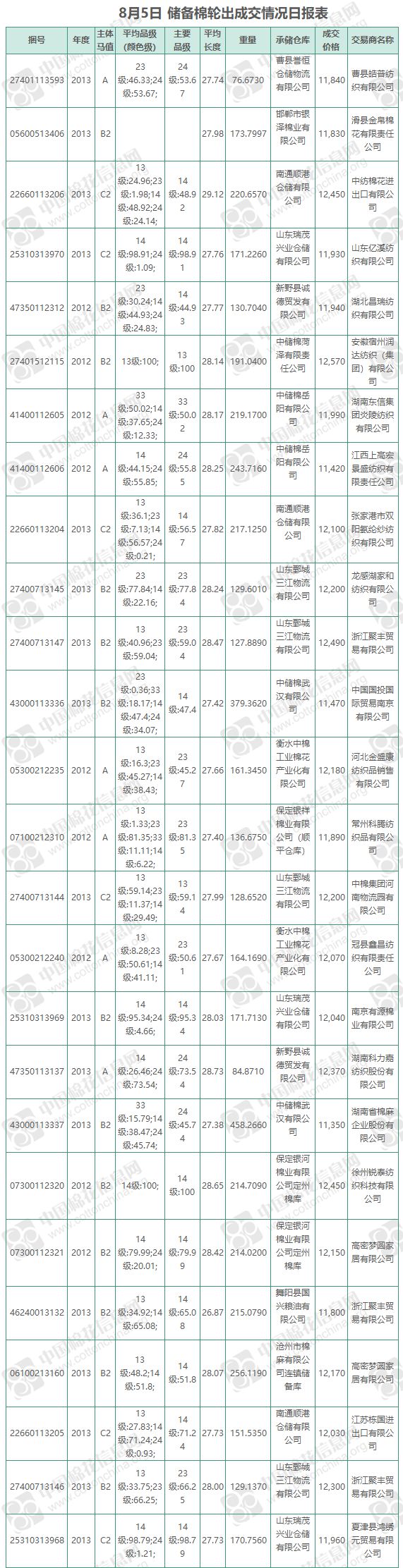 8月6日儲備棉輪出銷售資源9292.3563噸,實際成交2841.887噸,成交率30.58%,成交均價11984元/噸,較5日上漲10元/噸;折3128價格13403元/噸,較5日下跌97元/噸。