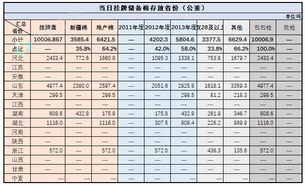 2.當(dāng)日輪出上市儲(chǔ)備棉中有部分為分批抽樣公檢。抽樣比率及抽樣方法按照棉花國(guó)家標(biāo)準(zhǔn)規(guī)定,品質(zhì)指標(biāo)包括顏色級(jí)、軋工質(zhì)量、長(zhǎng)度、馬克隆值、斷裂比強(qiáng)度、長(zhǎng)度整齊度指標(biāo);重量采用原入庫公檢結(jié)果,不再重新檢驗(yàn)。
