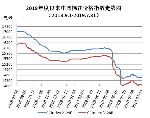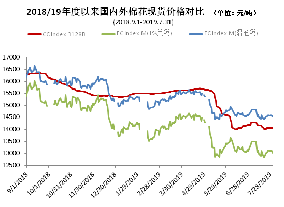 7月,國內(nèi)外棉花價格先漲后跌,整體較6月繼續(xù)下滑,但跌幅收窄。月初中美重啟貿(mào)易談判,市場信心有所提振,棉花價格反彈。月中由于紡織市場整體仍維持弱勢,棉花價格重新走低。在維持較長時間的原料低庫存后,紡織企業(yè)加大采購力度,皮棉實際成交量增加,儲備棉輪出成交量也有所增長。國際市場與國內(nèi)走勢基本一致,棉花期、現(xiàn)貨價格震蕩走低,月末內(nèi)外棉價差基本維持穩(wěn)定。