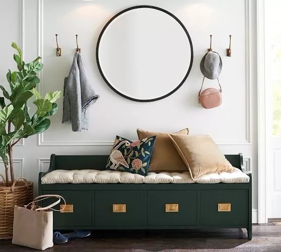 換鞋、脫大衣的柜面/凳子,不需要占據(jù)太多地方,夠2個(gè)人坐的尺寸即可,亞麻墊坐著夠舒服,越看越耐看,這種設(shè)計(jì)也不容易過(guò)時(shí)。