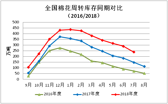 7月棉花市場(chǎng)基本面沒有大的變化,棉花市場(chǎng)價(jià)格跌勢(shì)趨緩。隨著原料庫存的逐步消耗,多數(shù)紡織企業(yè)有補(bǔ)庫需求,適當(dāng)加大對(duì)原料采購量,月末全國棉花周轉(zhuǎn)庫存大幅度下降。據(jù)中國棉花協(xié)會(huì)棉花物流分會(huì)對(duì)全國18個(gè)省市的164家棉花交割和監(jiān)管倉庫調(diào)查數(shù)據(jù)顯示:7月底全國棉花周轉(zhuǎn)庫存總量約239.62萬噸,較上月減少52.12萬噸,同比仍高90.3萬噸。