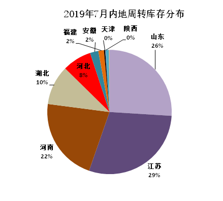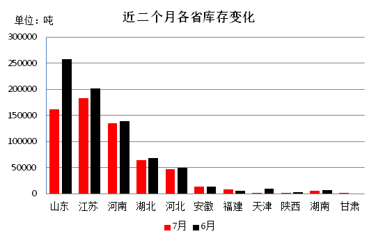 從各省庫存分布情況看:江蘇省庫存量居首位,為18.32萬噸,山東省次之16.23萬噸,河南省居第三位13.57萬噸,湖北省6.43萬噸,河北省4.73萬噸,安徽省1.36萬噸,其他省在萬噸以下。