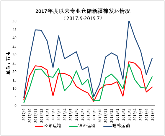 2018年9月-2019年7月出疆棉公路與鐵路共發(fā)運(yùn)292.24萬噸,同比減少42.26萬噸,降幅12.63%。