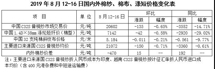 本周,針對(duì)美國(guó)宣布將對(duì)約3000億美元自華進(jìn)口商品加征10%關(guān)稅,中方表示將不得不采取必要的反制措施,市場(chǎng)悲觀(guān)情緒再度加劇,國(guó)內(nèi)棉價(jià)繼續(xù)下跌。2019年8月12-16日,代表內(nèi)地標(biāo)準(zhǔn)級(jí)皮棉銷(xiāo)售價(jià)格的國(guó)家棉花價(jià)格B指數(shù)13570元/噸,較上周下跌161元/噸,跌幅1.17%;鄭州棉花期貨主力合約結(jié)算均價(jià)12822元/噸,較上周下跌27元/噸,跌幅0.21%;儲(chǔ)備棉輪出成交均價(jià)11960元/噸,較上周下跌60元/噸,跌幅0.50%