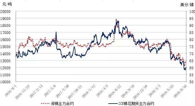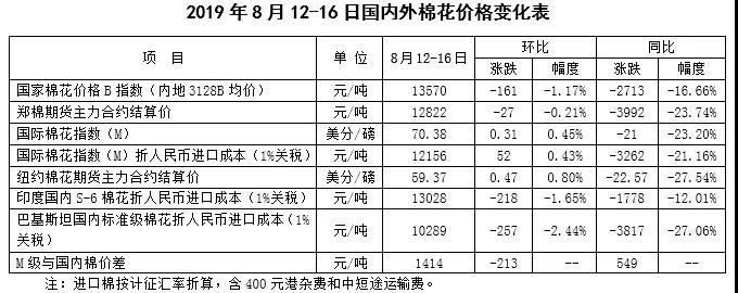 本周,受美國(guó)棉區(qū)天氣炎熱和良好的美棉出口數(shù)據(jù)推動(dòng),國(guó)際棉花價(jià)格小幅上漲。2019年8月12-16日,紐約棉花期貨主力合約結(jié)算價(jià)59.37美分/磅,較上周上漲0.47美分/磅,漲幅0.8%,代表進(jìn)口棉中國(guó)主港到岸均價(jià)的國(guó)際棉花指數(shù)(M)70.38美分/磅,較上周上漲0.31美分/磅,漲幅0.45%,折人民幣進(jìn)口成本12156元/噸,較上周上漲52元/噸,漲幅0.43%;內(nèi)外棉價(jià)差1414元/噸,較上周縮小213元/噸。