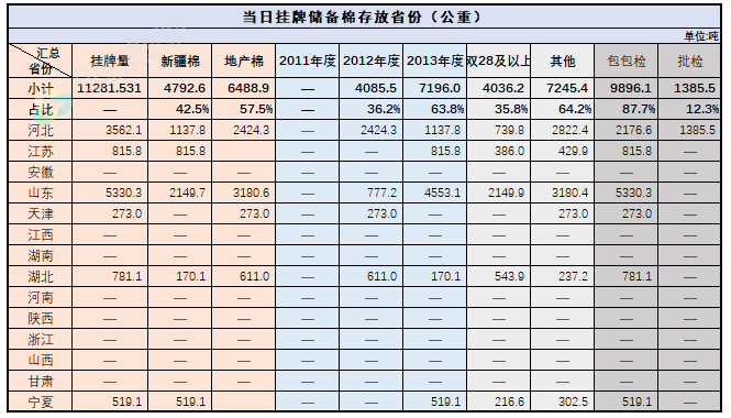 2.當(dāng)日輪出上市儲(chǔ)備棉中有部分為分批抽樣公檢。抽樣比率及抽樣方法按照棉花國(guó)家標(biāo)準(zhǔn)規(guī)定,品質(zhì)指標(biāo)包括顏色級(jí)、軋工質(zhì)量、長(zhǎng)度、馬克隆值、斷裂比強(qiáng)度、長(zhǎng)度整齊度指標(biāo);重量采用原入庫(kù)公檢結(jié)果,不再重新檢驗(yàn)。