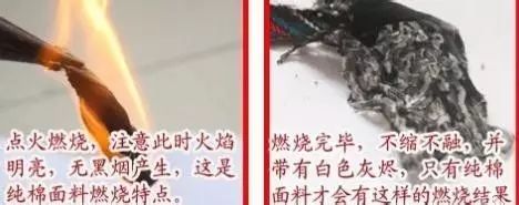 人造棉靠近火焰,迅速燃燒,就像我們燒塑料一樣出現(xiàn)黑煙和卷曲溶化,棉含量越低膠質(zhì)感越強(qiáng)。棉靠近火焰,不縮不熔。接觸火焰,迅速燃燒,火焰桔黃色,有藍(lán)色煙。離開(kāi)火焰,繼續(xù)燃燒,燒紙起味灰燼少,呈線狀?;夷┘?xì)軟,呈淺灰色,手觸易成粉末。