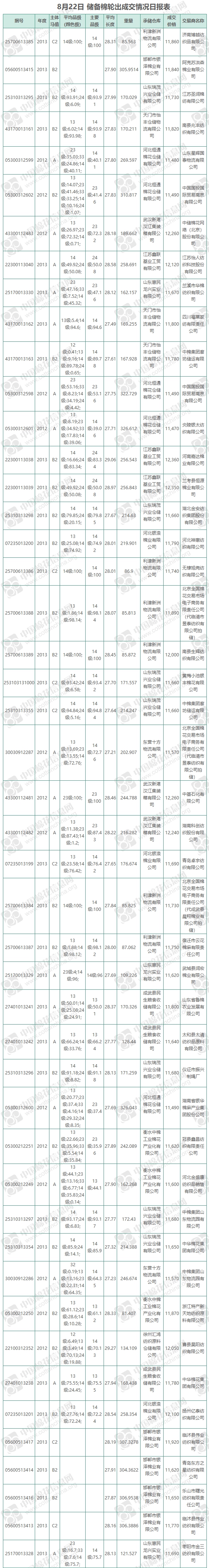 8月22日儲備棉輪出銷售資源11253.9208噸,實際成交9447.0568噸,成交率83.94%,成交均價11778元/噸,較前一交易日下跌21元/噸;折3128價格13187元/噸,較前一交易日上漲133元/噸。