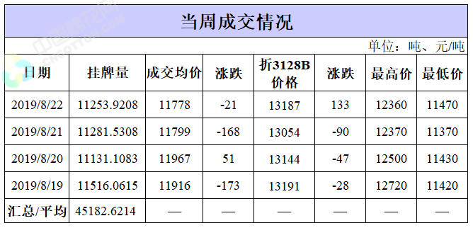 截至8月22日累計輪出銷售資源84.71萬噸,成交最高價15930元/噸,成交最低價11290元/噸。