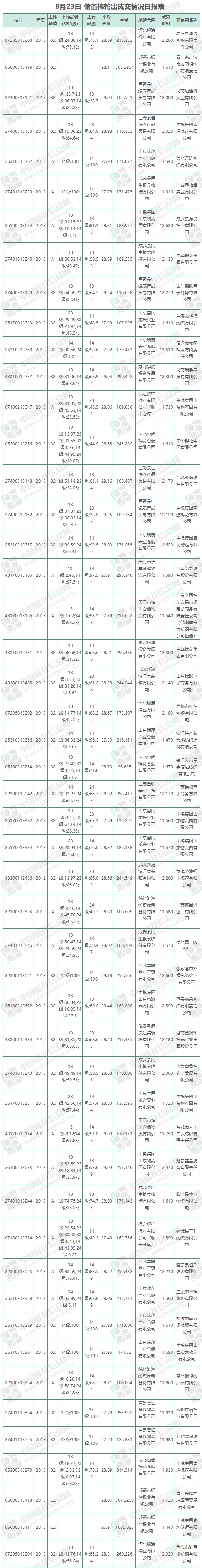 8月23日儲(chǔ)備棉輪出銷(xiāo)售資源11781.6668噸,實(shí)際成交10438.2598噸,成交率88.60%,成交均價(jià)11880元/噸,較22日上漲102元/噸;折3128價(jià)格13026元/噸,較22日下跌161元/噸。