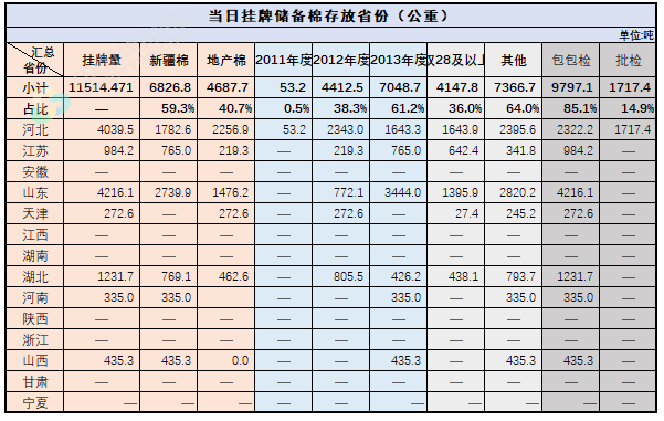2.當日輪出上市儲備棉中有部分為分批抽樣公檢。抽樣比率及抽樣方法按照棉花國家標準規(guī)定,品質指標包括顏色級、軋工質量、長度、馬克隆值、斷裂比強度、長度整齊度指標;重量采用原入庫公檢結果,不再重新檢驗。