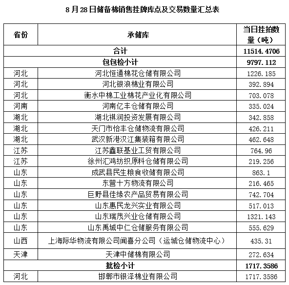 中國儲備棉管理有限公司定于8月28日上市銷售儲備棉重量11514.4706噸,共60捆。