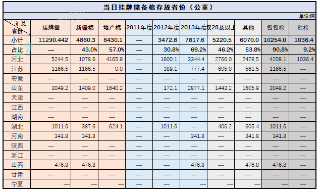 2.當日輪出上市儲備棉中有部分為分批抽樣公檢。抽樣比率及抽樣方法按照棉花國家標準規(guī)定,品質指標包括顏色級、軋工質量、長度、馬克隆值、斷裂比強度、長度整齊度指標;重量采用原入庫公檢結果,不再重新檢驗。