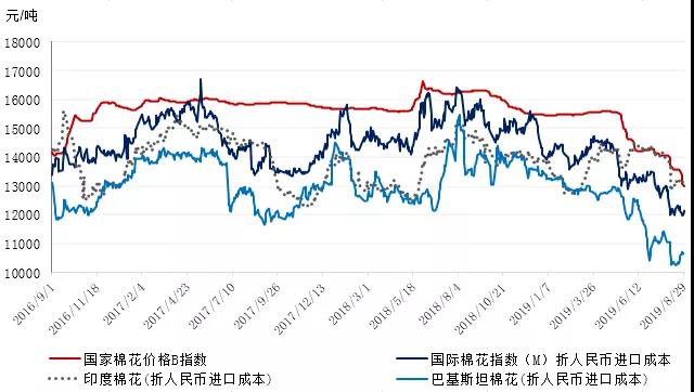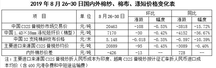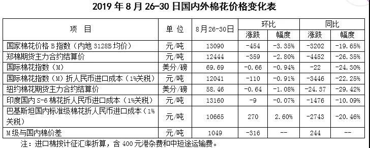 本周受美方宣布將提高對約5500億美元中國輸美商品加征關(guān)稅影響,國內(nèi)棉價跌幅加大。2019年8月26-30日代表內(nèi)地標準級皮棉銷售價格的國家棉花價格B指數(shù)13090元/噸,較上周下跌454元/噸,跌幅3.35%;鄭州棉花期貨主力合約結(jié)算均價12444元/噸,較上周下跌359元/噸,跌幅2.8%;儲備棉輪出成交均價11586/噸,較上周下跌285元/噸,跌幅2.4%。