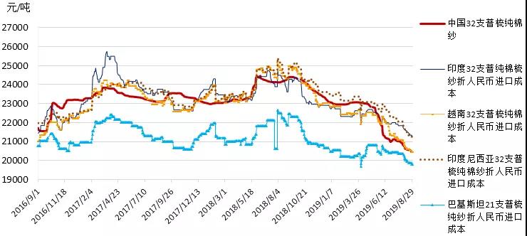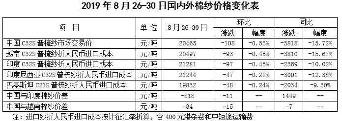 本周中美貿(mào)易緊張關(guān)系升級打壓投資者情緒,且美棉出口再次下滑,國際棉價繼續(xù)承壓走低。2019年8月26-30日紐約棉花期貨主力合約結(jié)算價58.46美分/磅,較上周下跌0.64美分/磅,跌幅1.08%,代表進口棉中國主港到岸均價的國際棉花指數(shù)(M)69.69美分/磅,較上周下跌0.66美分/磅,幅跌0.94%,折人民幣進口成本12041元/噸,較上周下跌110元/噸,跌幅0.91%;內(nèi)外棉價差1049元/噸,較上周縮小49元/噸.