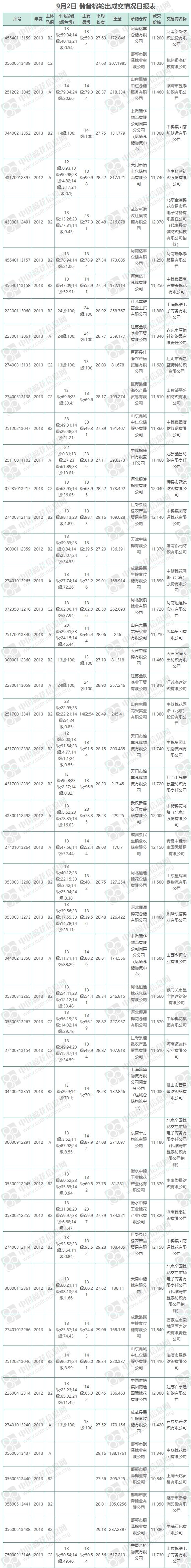 9月2日儲(chǔ)備棉輪出銷售資源11672.8178噸,實(shí)際成交10226.9379噸,成交率87.61%,成交均價(jià)11551元/噸,較30日下跌83元/噸;折3128價(jià)格12775元/噸,較30日下跌228元/噸。