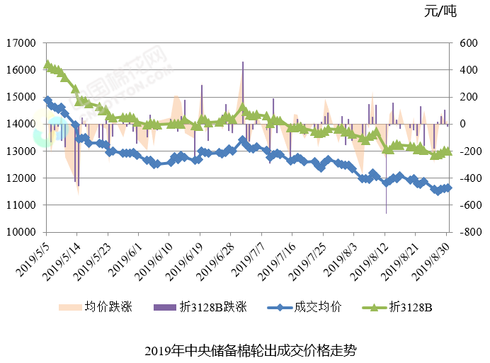 上周(2019年8月26-30日)是2019年中央儲(chǔ)備棉輪出第十七周,中國儲(chǔ)備棉管理有限公司掛牌銷售中央儲(chǔ)備棉5.80萬噸,其中新疆棉3.27萬噸,地產(chǎn)棉2.53萬噸。