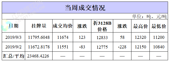 截至9月3日累計(jì)輪出銷售資源94.04萬噸,成交最高價(jià)15930元/噸,成交最低價(jià)10750元/噸。