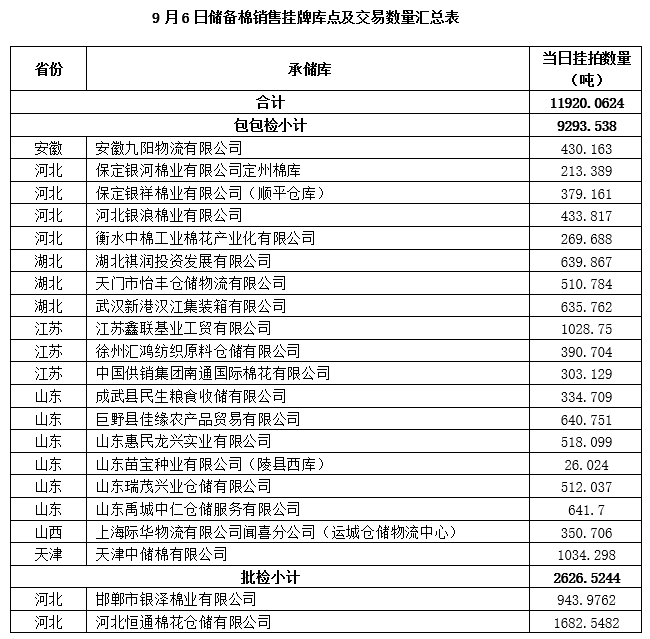 中國(guó)儲(chǔ)備棉管理有限公司定于9月6日上市銷售儲(chǔ)備棉重量11920.0624噸,共63捆。