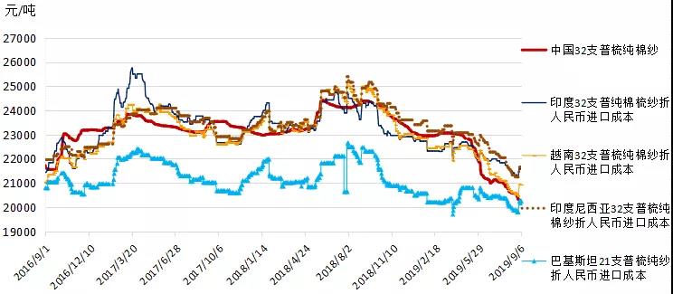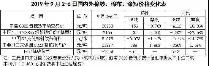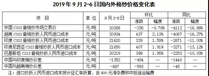 本周,中美貿(mào)易談判重啟,國(guó)內(nèi)棉紗市場(chǎng)氣氛略顯回穩(wěn),但訂單未見明顯好轉(zhuǎn),純棉紗價(jià)格弱穩(wěn)為主;受原料上漲影響,國(guó)際棉紗市場(chǎng)交投情緒略顯好轉(zhuǎn),印度和巴基斯坦棉紗價(jià)格出現(xiàn)上漲跡象,9月計(jì)征匯率調(diào)整后,常規(guī)純棉外紗均價(jià)高于國(guó)產(chǎn)紗價(jià)格1009元/噸;國(guó)內(nèi)純棉布降價(jià)走量,庫(kù)存仍處高位;滌綸短纖價(jià)格隨原料PTA走勢(shì)回暖。