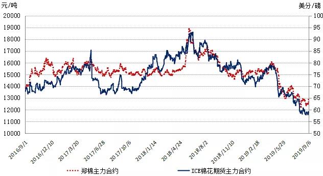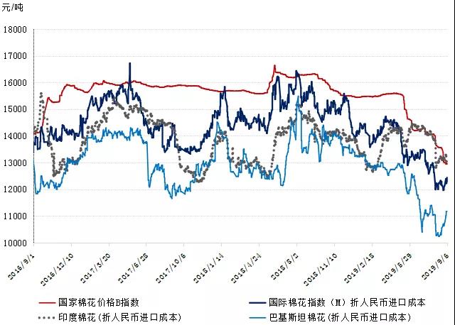 本周,市場(chǎng)受中美貿(mào)易形勢(shì)左右,第13輪中美經(jīng)貿(mào)磋商重啟消息公布后,市場(chǎng)悲觀情緒稍有好轉(zhuǎn),鄭棉期貨價(jià)格上漲,皮棉現(xiàn)貨價(jià)格先跌后漲。2019年9月2-6日,代表內(nèi)地標(biāo)準(zhǔn)級(jí)皮棉銷售價(jià)格的國(guó)家棉花價(jià)格B指數(shù)均價(jià)12958元/噸,較上周下跌132元/噸,跌幅1.01%;鄭州棉花期貨主力合約結(jié)算均價(jià)12618元/噸,較上周上漲174元/噸,漲幅1.4%;儲(chǔ)備棉輪出成交均價(jià)11723/噸,較上周上漲138元/噸,漲幅1.19%。