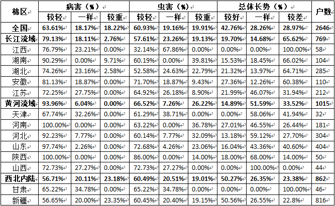 長江流域8月持續(xù)干旱,有灌溉條件的,長勢較好;沒有灌溉條件的長勢很差,棉株發(fā)黃,葉片脫落沖頂,花蕾脫落,中上部空桿,幾乎沒有秋桃,下部棉桃少且小,減產(chǎn)已成定局。江蘇省受天氣影響較大,部分棉田出現(xiàn)積水,倒伏嚴重,有死株現(xiàn)象,爛桃較多,棉農(nóng)都在采摘爛鈴。今年8月情況與去年類似,高溫干旱并伴有臺風,所以棉花生長情況大致類似,平均每株花鈴比為69.12%,同比持平;吐絮比例為14.58%,同比增加1.7個百分點;采摘比例為16.30%,同比減少1.7個百分點。病蟲害較輕發(fā)生,但重于去年,認為病害較輕發(fā)生的占總調查戶數(shù)的79.13%,同比減少2.6個百分點,局部田塊黃萎病發(fā)生較重;反映蟲害較輕發(fā)生的占總調查戶的57.61%,同比減少16.1個百分點,主要是干旱導致紅蜘蛛發(fā)生較重,盲蝽蟓、棉鈴蟲、白飛虱一般發(fā)生。認為棉花長勢較差的占總調查戶的19.7%,同比減少10.8個百分點。長江流域預計產(chǎn)量36.1萬噸,同比減少11.34%,較上期下調2.3萬噸,單產(chǎn)同比下降2.95%。