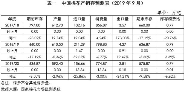 本期月報將2018/19年度棉花進口量調(diào)增1.47萬噸至211.29萬噸,棉花出口量調(diào)增0.91萬噸至4.27萬噸;將2019/20年度棉花進口量調(diào)減13.34萬噸至156.66萬噸,棉花消費量調(diào)減13.34萬噸至774.87萬噸,出口量調(diào)增0.18萬噸至2.81萬噸。詳見下表。