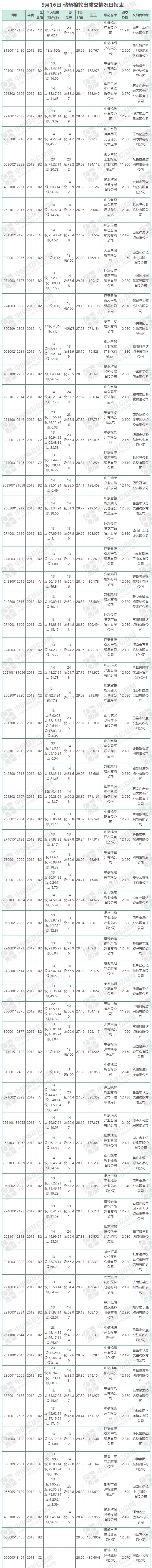 9月16日儲備棉輪出銷售資源11940.0042噸,實際成交11940.0042噸,成交率100%,成交均價12179元/噸,較12日上漲178元/噸;折3128價格13408元/噸,較12日下跌64元/噸。