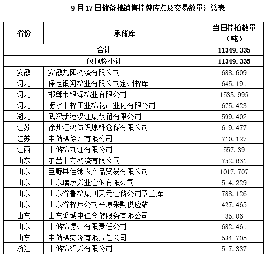 中國(guó)儲(chǔ)備棉管理有限公司定于9月17日上市銷售儲(chǔ)備棉重量11349.335噸,共71捆。