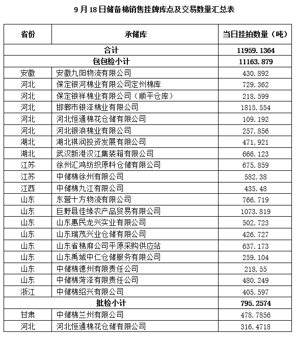中國(guó)儲(chǔ)備棉管理有限公司定于9月18日上市銷售儲(chǔ)備棉重量11959.1364噸,共70捆。