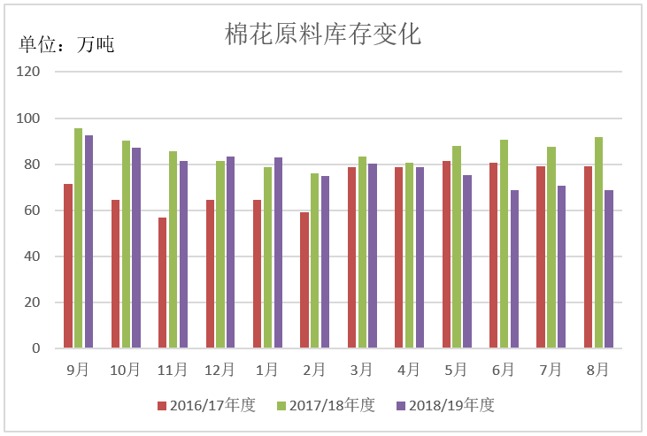 盡管本月期現(xiàn)貨價(jià)格繼續(xù)下跌,部分企業(yè)逢低補(bǔ)庫,但原料庫存整體仍有所下降。截至8月31日紡織企業(yè)棉花庫存量68.73萬噸,較上月底減少1.82萬噸,同比減少22.89萬噸。其中33%企業(yè)減少棉花庫存,28%增加庫存,39%基本保持不變。