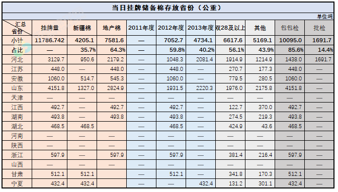 2.當日輪出上市儲備棉中有部分為分批抽樣公檢。抽樣比率及抽樣方法按照棉花國家標準規(guī)定,品質(zhì)指標包括顏色級、軋工質(zhì)量、長度、馬克隆值、斷裂比強度、長度整齊度指標;重量采用原入庫公檢結(jié)果,不再重新檢驗。